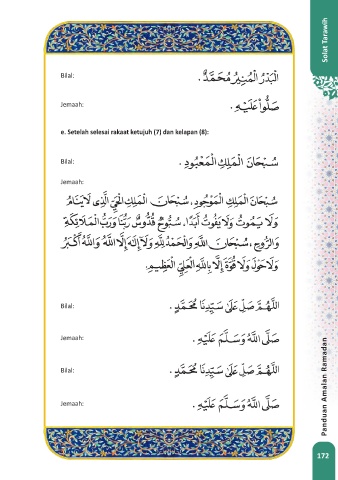 Solat Tarawih Bilal: Jemaah: e. Setelah selesai rakaat ketujuh (7) dan kelapan (8): Bilal: Jemaah: Bilal: Jemaah: Panduan Amalan Ramadan Bilal: Jemaah: 172