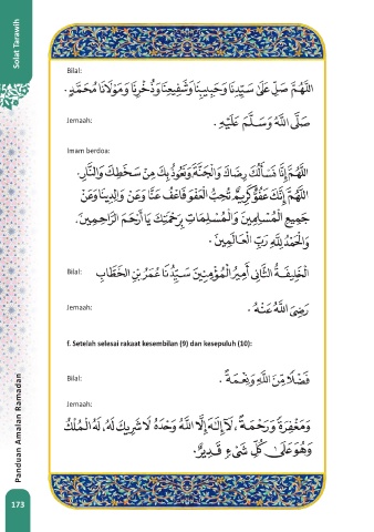 Solat Tarawih Bilal: Jemaah: Imam berdoa: Bilal: Jemaah: f. Setelah selesai rakaat kesembilan (9) dan kesepuluh (10): Bilal: Panduan Amalan Ramadan Jemaah: 173
