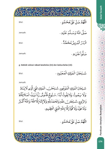 Solat Tarawih Bilal: Jemaah: Bilal: Jemaah: g. Setelah selesai rakaat kesebelas (11) dan kedua belas (12): Bilal: Jemaah: Panduan Amalan Ramadan Bilal: 174