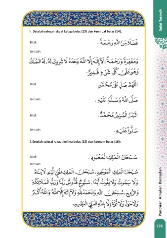 Solat Tarawih h. Setelah selesai rakaat ketiga belas (13) dan keempat belas (14): Bilal: Jemaah: Bilal: Jemaah: Bilal: Jemaah: i. Setelah selesai rakaat kelima belas (15) dan keenam belas (16): Bilal: Jemaah: Panduan Amalan Ramadan 176