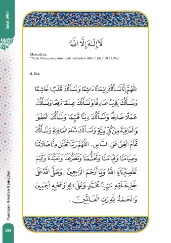 Solat Witir Maksudnya: “Tiada Tuhan yang disembah melainkan Allah.” (33 / 50 / 100x) d. Doa Panduan Amalan Ramadan 189