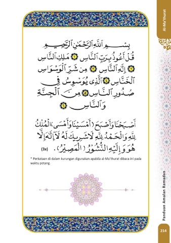 Al-Ma’thurat (3x) * Perkataan di dalam kurungan digunakan apabila al-Ma’thurat dibaca ini pada waktu petang. Panduan Amalan Ramadan 214